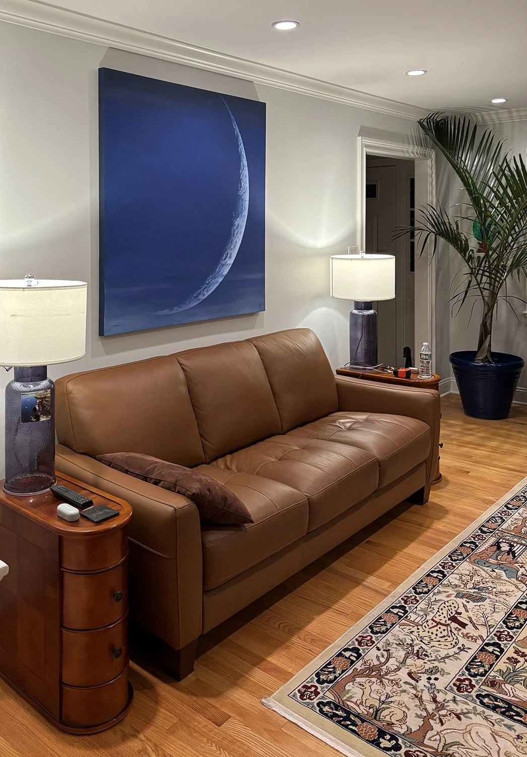 Bob Crelin’s Moon Dream© is a large-format original 48”x 48” work (acrylic on canvas) capturing the wonder and ethereal magic of the Early Crescent Moon, as it hangs silently aloft in the evening mist.